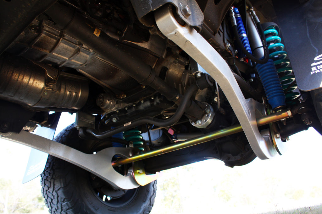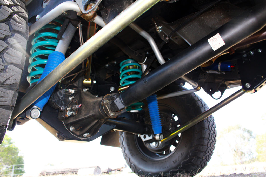 On a leaf spring vehicle the spring (leaf) also does the locating on the diff as it travels through the suspension cycle. A coil conversion replaces the factory leaf springs, shackles and bushes and replaces it with a steel fabricated crossmember that supports coil springs between the diff and chassis. The Upper and Lower control arms locate the diff as it travels through the suspension cycle, allowing the spring to do only what they do best – suspend the vehicle. Coil spring design allows the vehicle to have a wide range of spring load characteristics from soft comfy linear, dual rate for loaded and unloaded comfort or heavy duty for those that carry large constant loads. The Control arms accurately locate the diff as it travels up and down and the geometry is finely tuned to reduce dreaded rear steer and allow massive articulation while reducing tire to chassis interference. Link suspension also nearly eliminates wheel hop under acceleration which reduces load on the axles and gears.